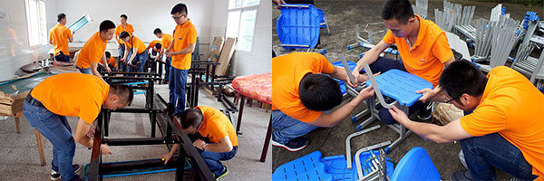 所有的捐赠物品,均由海因特团队亲自组装。为了保证质量的同时,更加高效,所有团队成员分成了餐桌组、书架组、桌子组、椅子组、贴膜组。看似简单的一张桌子、椅子,是由许多零件用一个个小螺丝连接起来的。在整个组装过程中,海因特团队分工协作、细化流程、注重细节、保障效率,增强了团队合作和沟通的能力。天非常闷热,经过三四个小时的作业,终于完成了所有的设施安装。团队成员虽然汗流浃背,但非常有成就感和使命感,能够为留守儿童送上温暖,再苦再累也不怕。