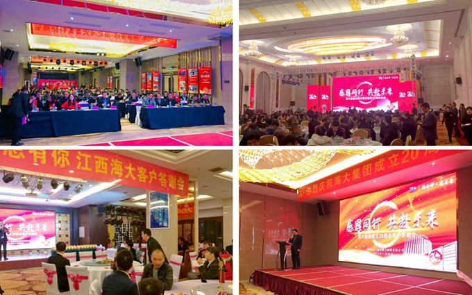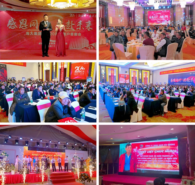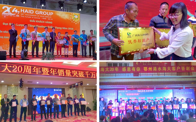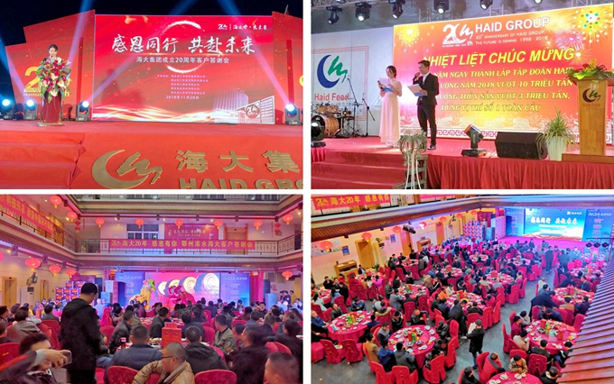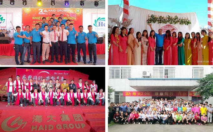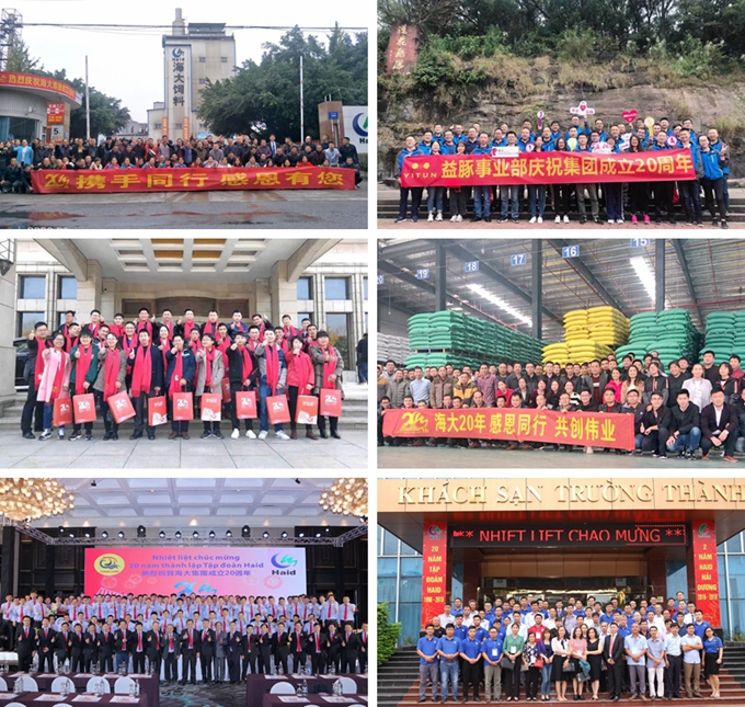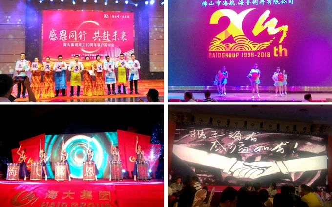成立二十周年庆典,集团庆祝活动的主要会场依然在离养殖一线最近的分子公司,各分子公司邀请业务区域内的养殖户、经销商和所有关心支持海大发展的友人参与活动,感谢客户在过去二十年的一路同行。