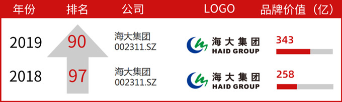 海大集团(股票代码:002311.SZ)与腾讯控股、阿里巴巴等企业共同上榜“2019中国上市公司品牌价值榜”总榜TOP100,排名90位,品牌价值343亿元,相比2018年名次提升了7位,品牌价值增长30%,在农牧行业排名仅次于温氏股份和新希望,排名第三。