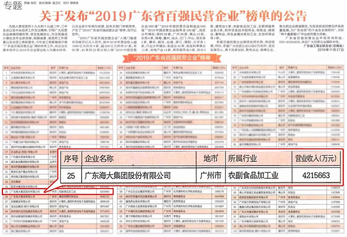 值得关注的是,海大集团在本次榜单中位列第25位,是本次登榜中为数不多的两家农副食品加工业企业之一,此前曾荣获“2019中国民营企业500强”、“2019中国民营企业制造业500强”等相关荣誉。