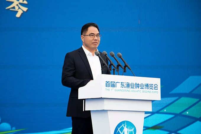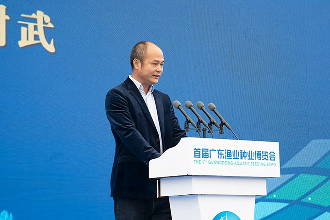 开幕式现场,海大集团副总裁江谢武作为企业代表登台发言,江总表示:广东是我国主要渔业大省,渔业以高产高效而闻名,水产养殖量全国第一,水产养殖技术保持全国领先,四大家鱼、罗非鱼、南美白对虾、乌鳢、加州鲈、鳜鱼等多个养殖品种引领国内最高发展水平,带动无数农民致富、农村兴旺,创造出巨大的经济效益和社会效益。