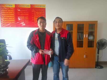 集团猪料部营销总助杨叁川代表集团为罹患重疾员工母兴勇颁发互助金爱心款3万元