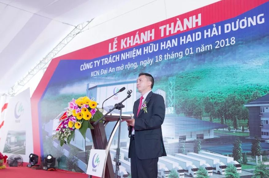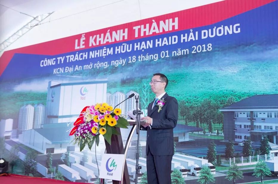 海大集团战略发展事业部越南区总经理兼海阳海大总经理唐明作了热情洋溢的致词,并向前来参加开业庆典的各位领导、各位贵宾表达了热烈的欢迎和诚挚的谢意。海阳海大用不到一年的时间建设成一座如此规模的现代化工厂,离不开集团、当地政府、原料供应商的大力支持,离不开工程建设者的辛劳付出、离不开公司建设生产经营团队的紧密协作,离不开与公司携手合作的经销商和养殖户!他坚信,公司必将以开业典礼为契机,把公司经营好,为海大集团在海外发展做出典范,为当地经济发展做出贡献,为经销商和养殖户创造价值和带来收益,为公司员工的成长和收益提供保障。