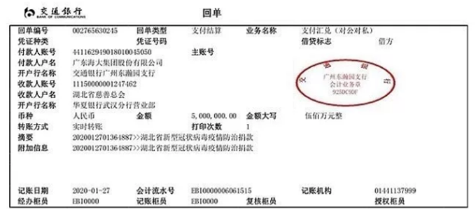 2020年1月27日向湖北省慈善总会捐款500万元