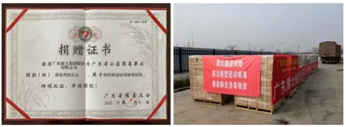 一方有难,八方支援。截止今天,海大集团通过湖北省慈善总会捐款500万元、广东省慈善会等捐赠了300万元消毒剂产品,旗下分子公司石家庄卫科生物科技有限公司向湖北武汉市红十字会捐赠50箱环境消毒泡腾片、向石家庄市第五医院、华中农大医院、晋州市政府、石家庄高新区政府、邢台市红十字会等机构共捐赠5吨二氧化氯消毒剂泡腾片,与一线工作者同心“战疫”,驰援疫情防控。集团时刻关怀每位员工,保驾护航,共克时艰,启动“海大互助基金”,为确诊新冠肺炎的员工提供5000元援助与慰问。